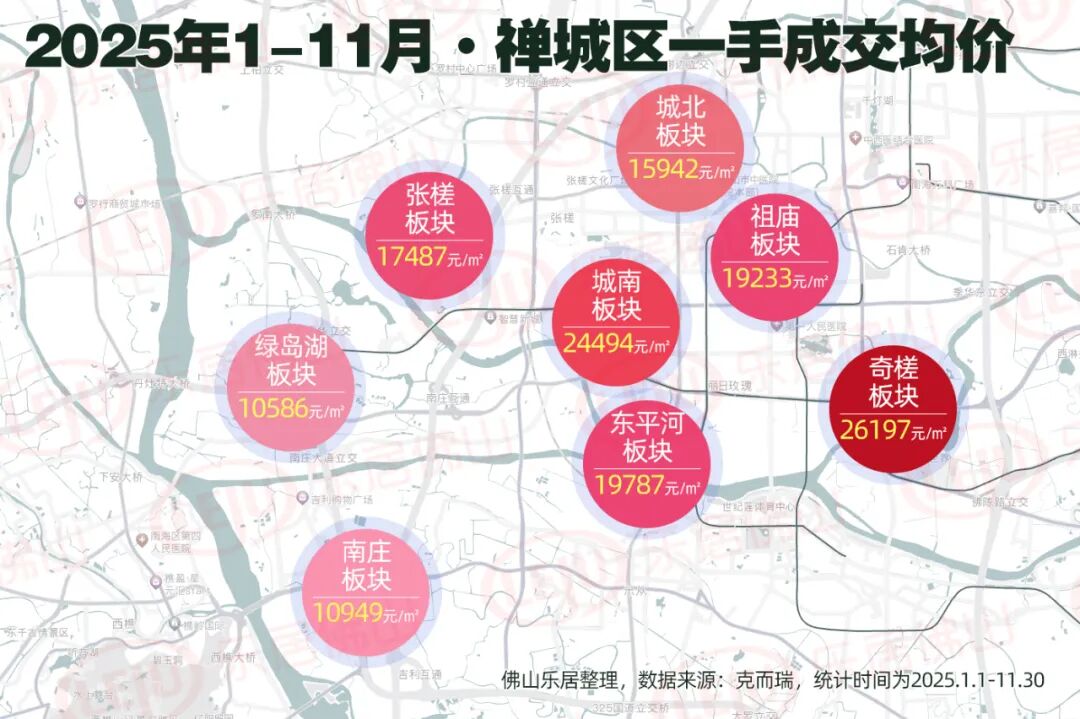 禅城区前11月成交最热的是城北,成交套数1069套,成交均价约15942元/㎡。