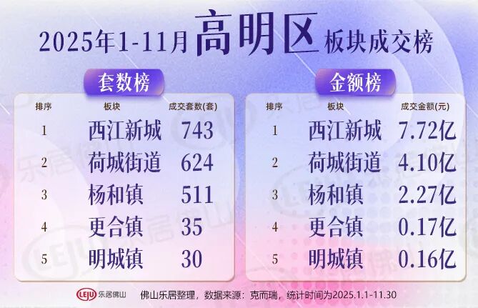 高明区高明区方面,西江新城以743套、7.72亿元位居榜首,荷城、杨和位列二、三。