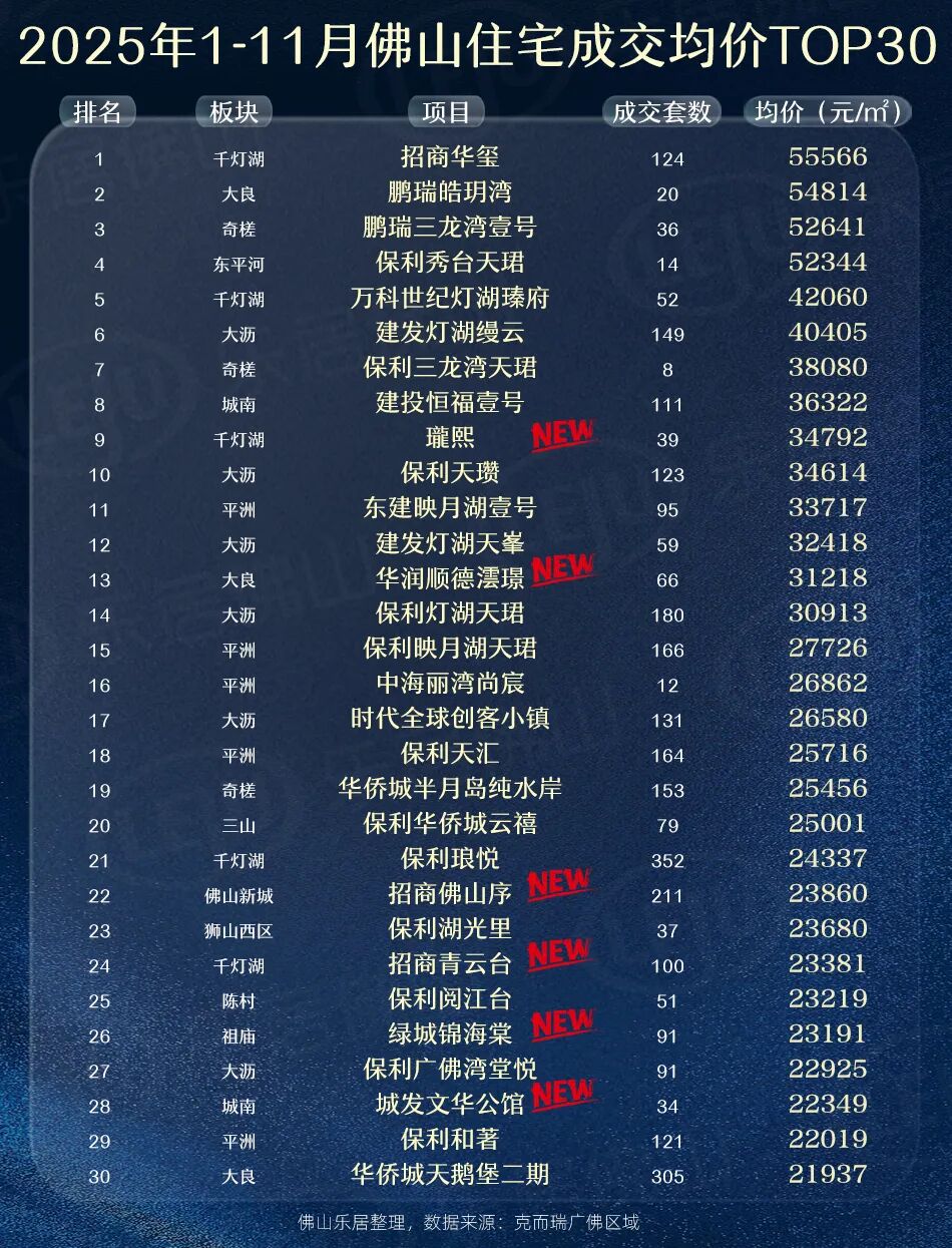 招商华玺以55566元/㎡稳坐佛山房价塔尖;鹏瑞皓玥湾、三龙湾1号分获二三,保利秀台天珺紧随其后,共4盘站稳5万+阵营!