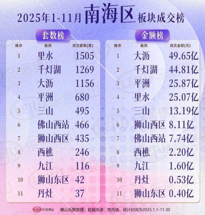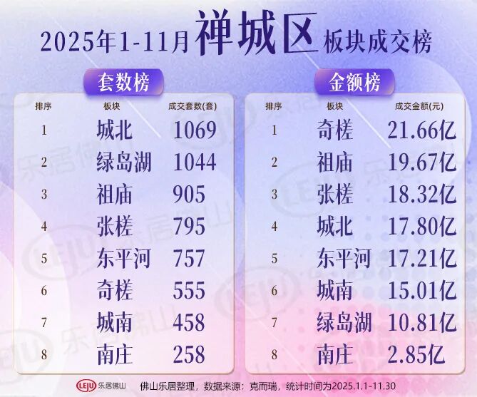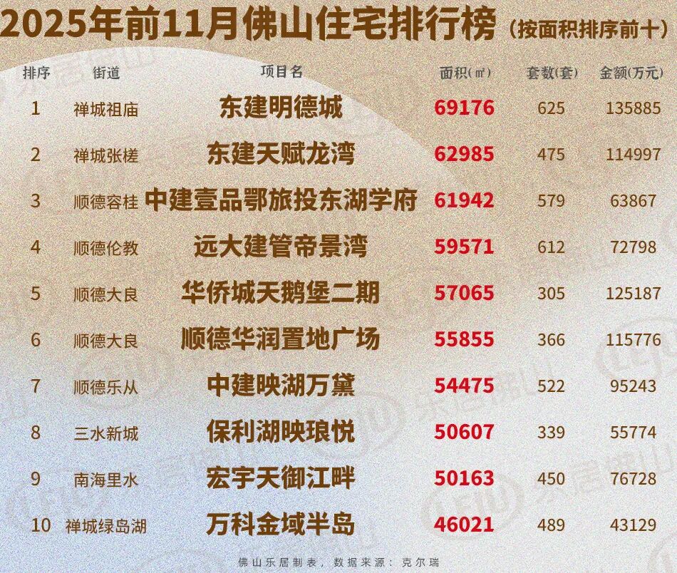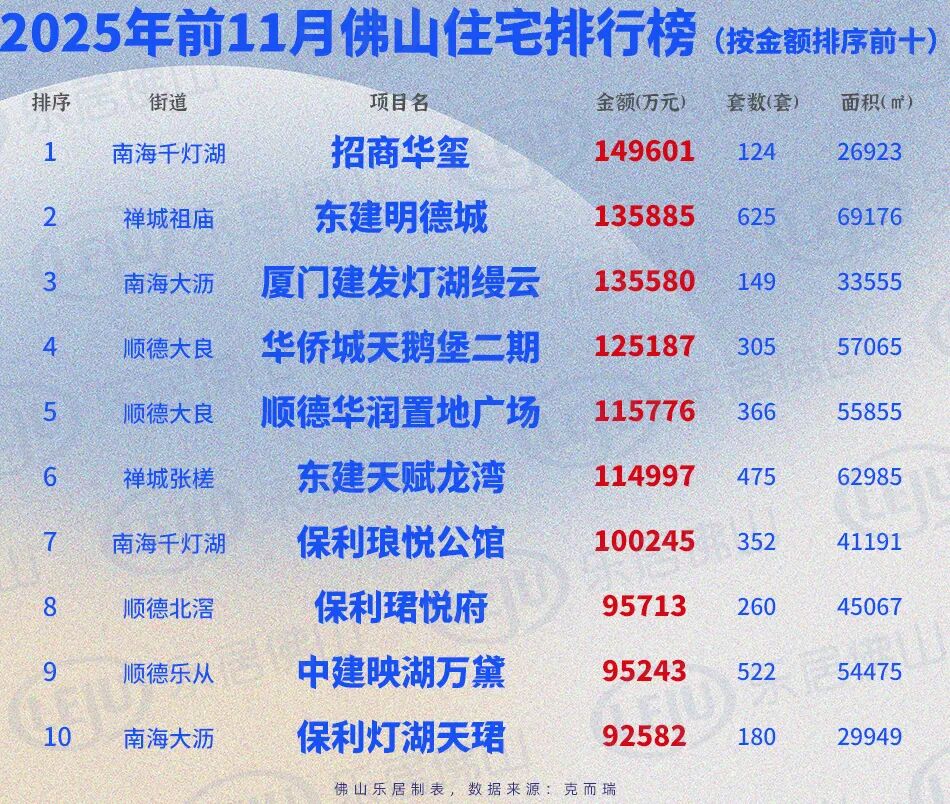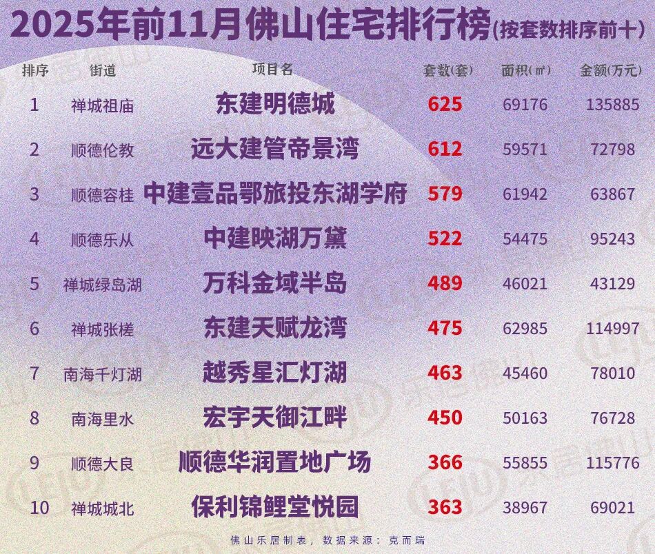 那么,哪些楼盘销量领先?禅城祖庙的东建明德城以625套、约6.92万㎡的摘得2025年前11月佛山新盘双料销冠,桂城千灯湖的招商华玺则以14.96亿元问鼎佛山前11月金额冠军。套数榜方面,顺德伦教的远大建管帝景湾以超600套位居第二,中建壹品鄂旅投东湖学府和中建映湖万黛以超500套分居三四位。