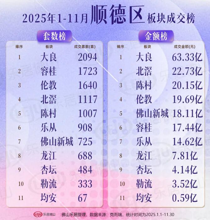 据克而瑞数据显示,2025年1-11新房板块成交套数最猛的前三强,全来自顺德。