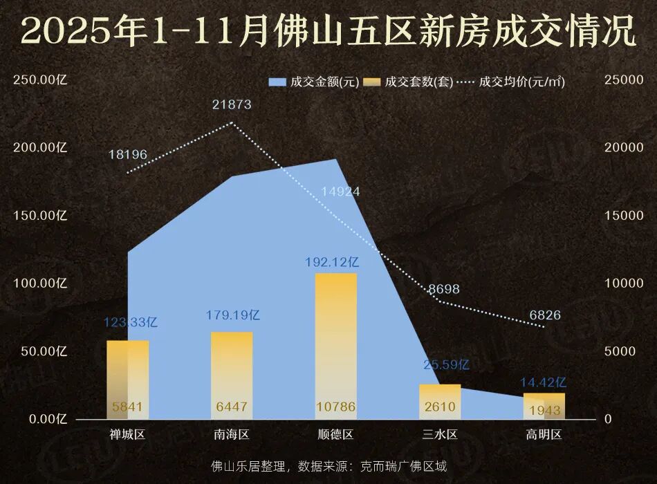 其中,顺德区在五区中高居榜首,以10786套、192.12亿成交领跑全市。