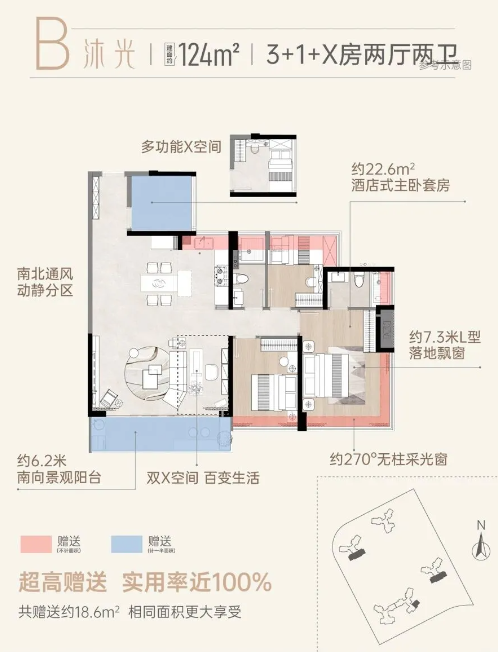而124㎡有两种户型,均为3+1+X房两厅两卫设计,其中一种为经典四房设计,主卧配套约7.3米L型落地窗;
