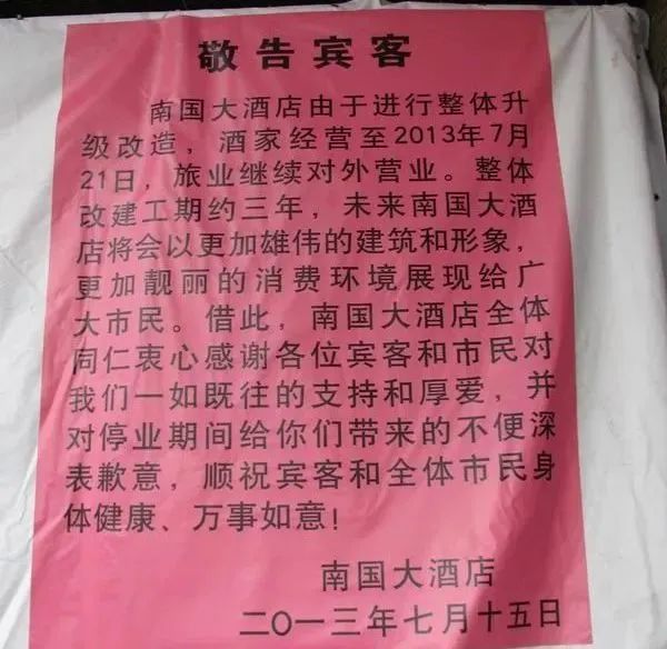 奈何就在拿地后不到一周,南国大酒店便贴出了“因升级改造停业三年”的通告。然而,这一停就一直停至今日。