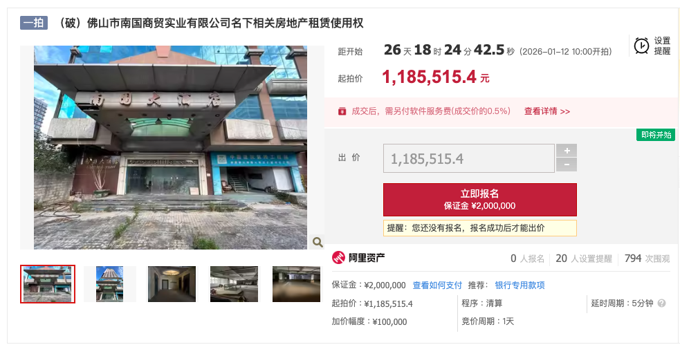 日前,乐居编辑获悉,佛山市南国商贸实业有限公司名下相关房地产租赁使用权正在阿里资产进行拍卖,起拍价118.55万/年起,拟将于2026年1月26日进行法拍。
