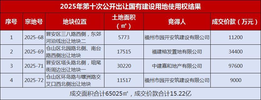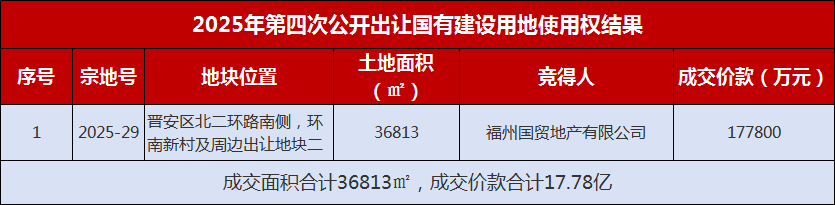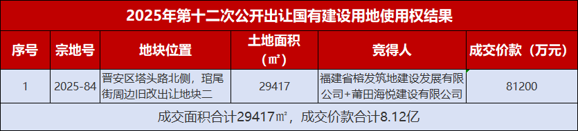 2025年福州四城区第十二场土拍落幕。晋安琯尾片区一幅约42.65亩“全安商房”地块仅一家房企参拍,最终被榕发筑地+莆田海悦联合体以8.12亿价格竞得,成交楼面价约7086元/㎡。不出意外,这将是福州四城区今年最后一场土拍。截至目前,福州四城区共进行12场土拍,出让地块64幅,合计约1638.8亩,成交价款278.58亿元,与全年300亿元出让目标仅一步之遥。