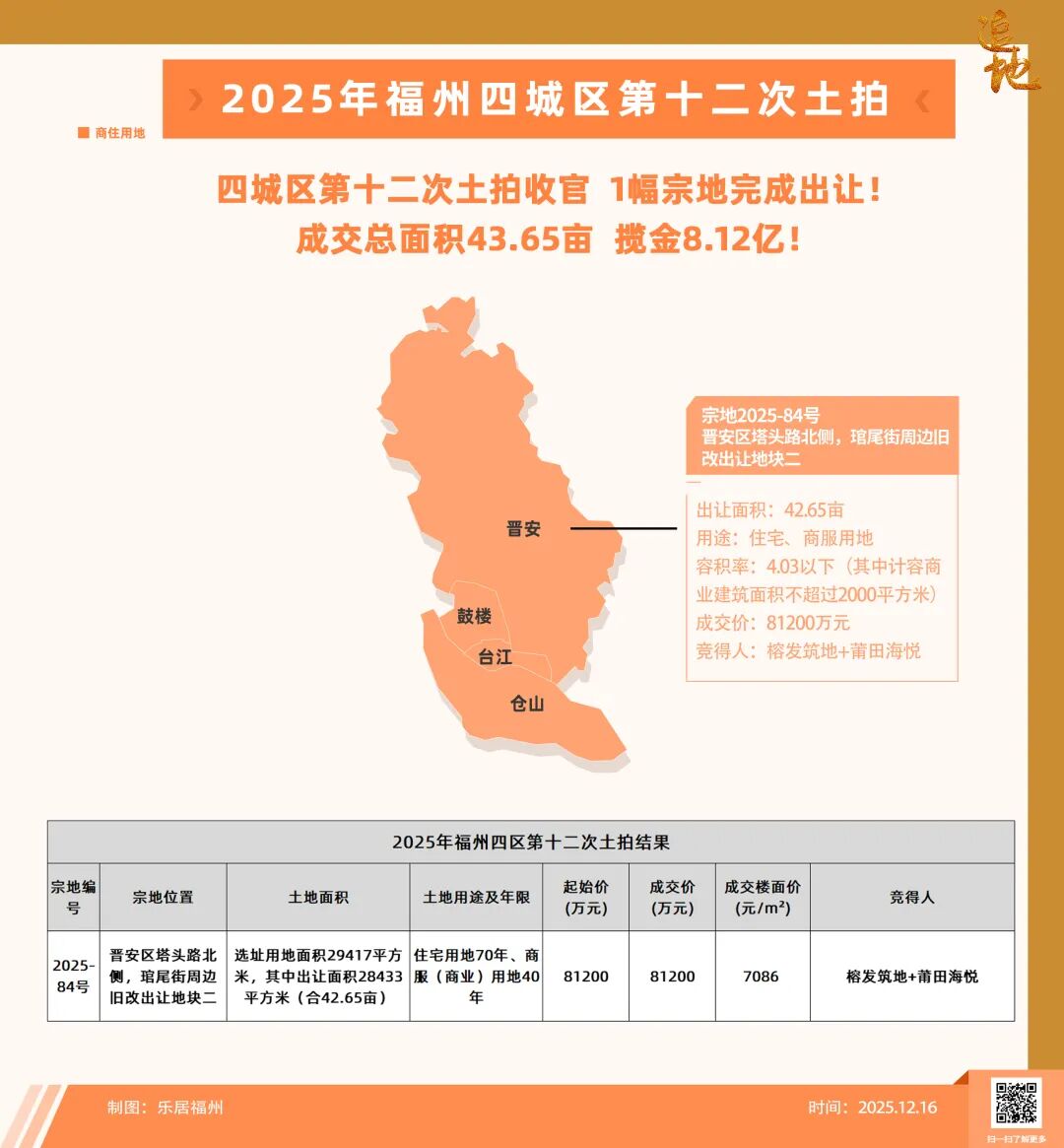 此次出让的宗地2025-84号是琯尾片区自征收以来成交的第二幅地块。地块最终被福建省榕发筑地建设发展有限公司+莆田海悦建设有限公司联合体以8.12亿底价竞得,成交楼面价约7086元/㎡。