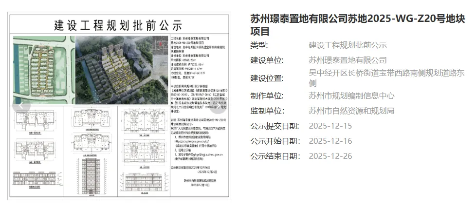 12月16日,苏州璟泰置地有限公司苏地2025-WG-Z20号地块项目规划批前公示,拟建35幢住宅,其中18幢3F联排、13幢4-6F叠墅、4幢17F小高层。