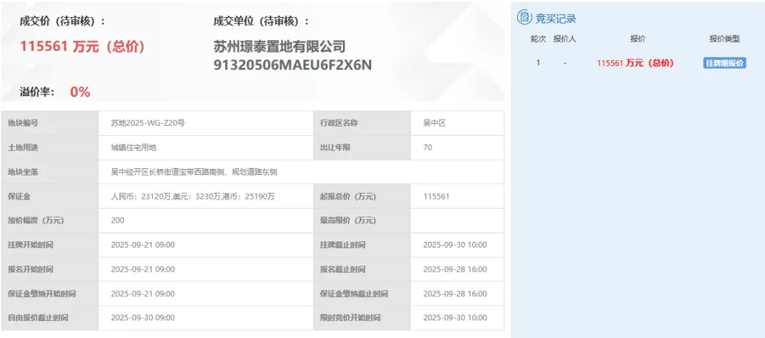 苏州璟泰置地于9月30日竞得吴中主城地块,成交总价115561万元,成交楼面价16000元/㎡。