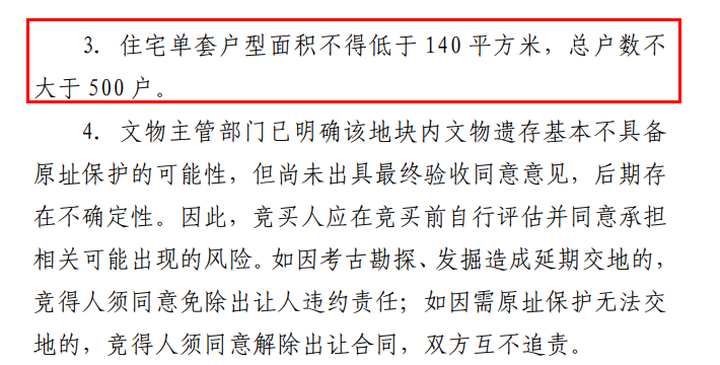 住宅单套户型面积不得低于140平方米,总户数不大于500户。