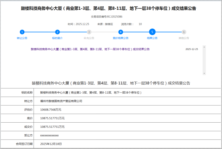 12月25日,福州市公共资源交易网发布一则成交公告,内容显示,一神秘企业以约10608.76万元底价竞得乌山西路鼓楼科技商务中心大厦标的,大厦转让方为福州市鼓楼国有资产营运有限公司。