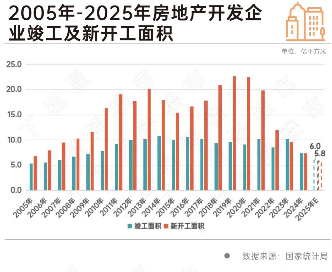 竣工方面,2025年预计全年竣工面积6亿平方米,同比下降18%。尽管新开工与竣工面积因统计口径差异不可直接对比,但从同比增速变化可捕捉积极信号:2025年竣工面积累计同比降幅控制在20%以内,显著小于三年前新开工40%的同比降幅,充分印证项目化险、保交房工作取得实质进展。