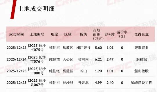 土地市场方面,上周无土地供应新增,但有4宗土地新增成交。成交土地包括:岳麓区湘江智谷板块的[2025]长沙市075号纯住宅地块,容积率仅1.01,被智墅置业底价摘得;岳麓区谷山板块底[2025]长沙市080号纯住宅地块,容积率也未1.01,被麓山控股底价摘得;位于天心区省府南的[2025]长沙市076号纯住宅地块,被润和城以底价摘得;位于长沙县开元北的[2025]长沙县067号纯住宅地块,被星峰建设工程底价摘得。