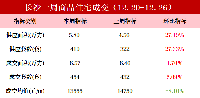 新房市场方面,上周(12.20-12.26)长沙内五区(含高新区、长沙县托管区域)一手住宅成交454套、6.57万方, 成交均价13555元/㎡。供应上,一手住宅新增供应410套、5.80万方。