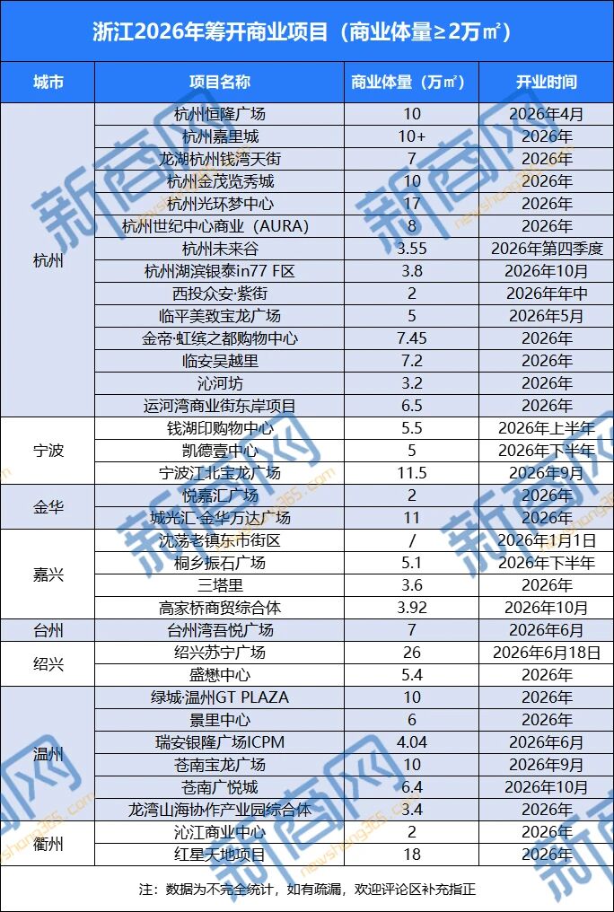 2026年浙江预计将新开34座商业综合体