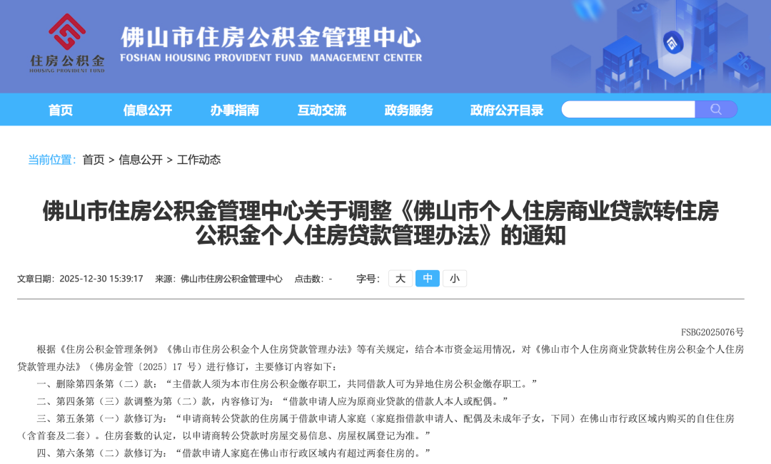 这是继2025年4月后,佛山“商转公”政策放松门槛,二套、异地公积金都可以申请。
