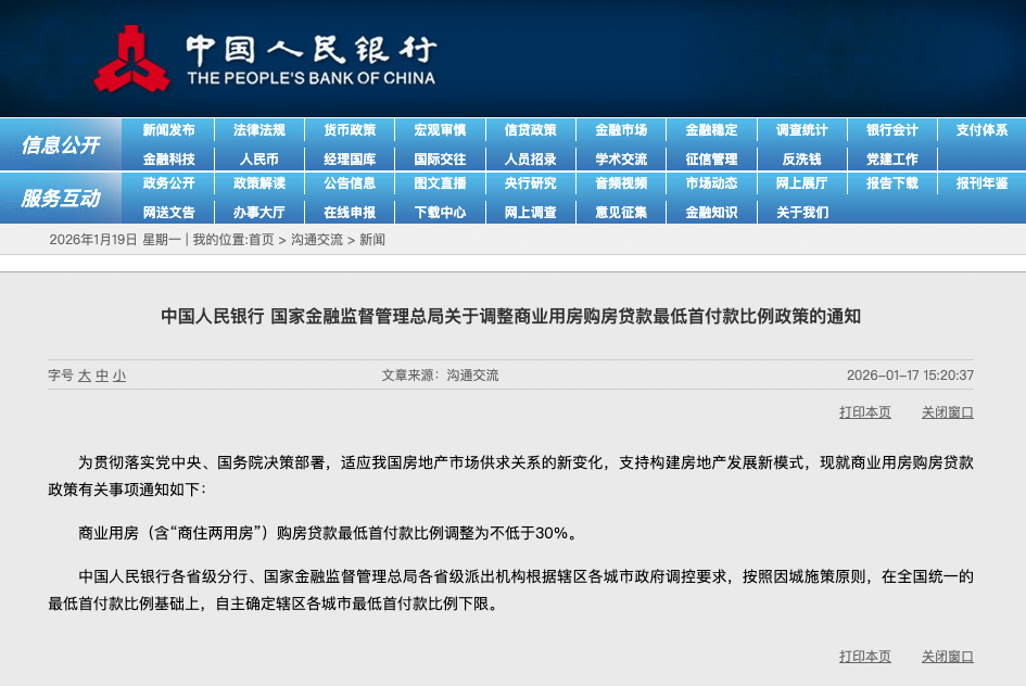 1月17日,中国人民银行、国家金融监督管理总局发布关于调整商业用房购房贷款最低首付款比例政策的通知,明确商业用房(含“商住两用房”)购房贷款最低首付款比例调整为不低于30%。