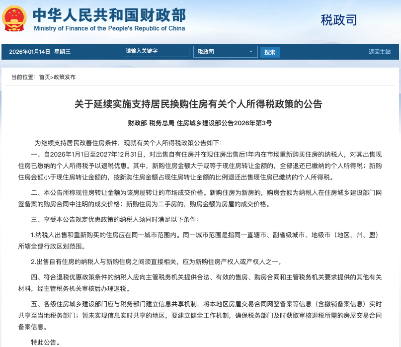 1月14日,财政部、税务总部、住房城乡建设部发布《关于延续实施支持居民换购住房有关个人所得税政策的公告》。