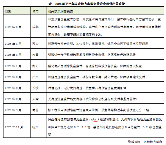 2025年以来,已有多地发布资金监管相关稳市场政策,譬如成都出台预售资金监管办法,明确三方协议与保函置换机制;西安推行保函置换监管资金,允许诚信企业下调重点额度;南昌则优化预售资金释放节点,按工程进度分档调整监管比例。其中福州11月发布的新政极具标志性意义。