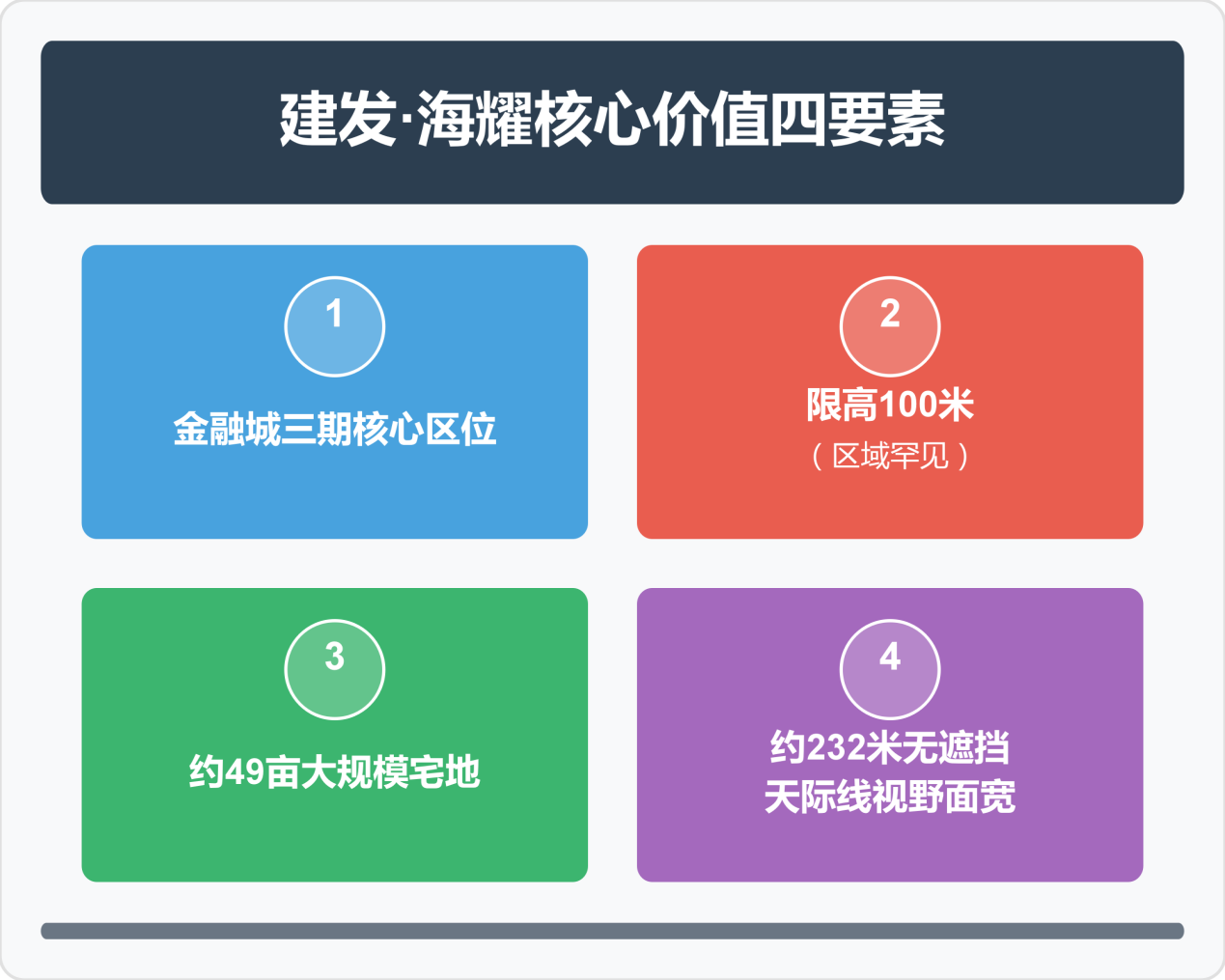 项目位于金融城三期核心,是区域内唯二限高100米的宅地,更是唯一集齐“约49亩大规模、无遮挡正看天际线、约232米视野面宽”三大稀缺要素的项目。