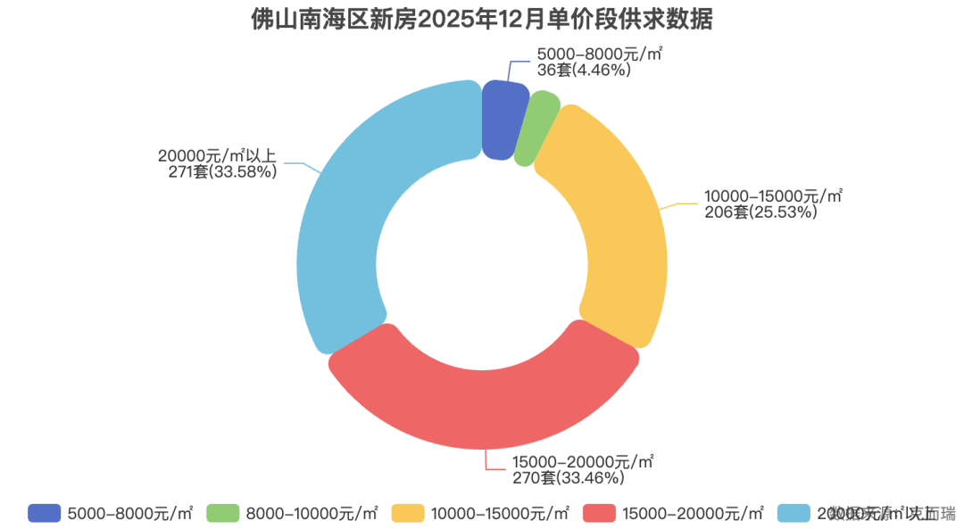其次,从价格段来看,2025年12月,南海区20000元/㎡以上的新房成交套数虽然只占一小部分,但其成交金额却占据了绝对主导地位。建发灯湖缦云约4.5万/㎡的单价,正处于这个高价值区间的核心。