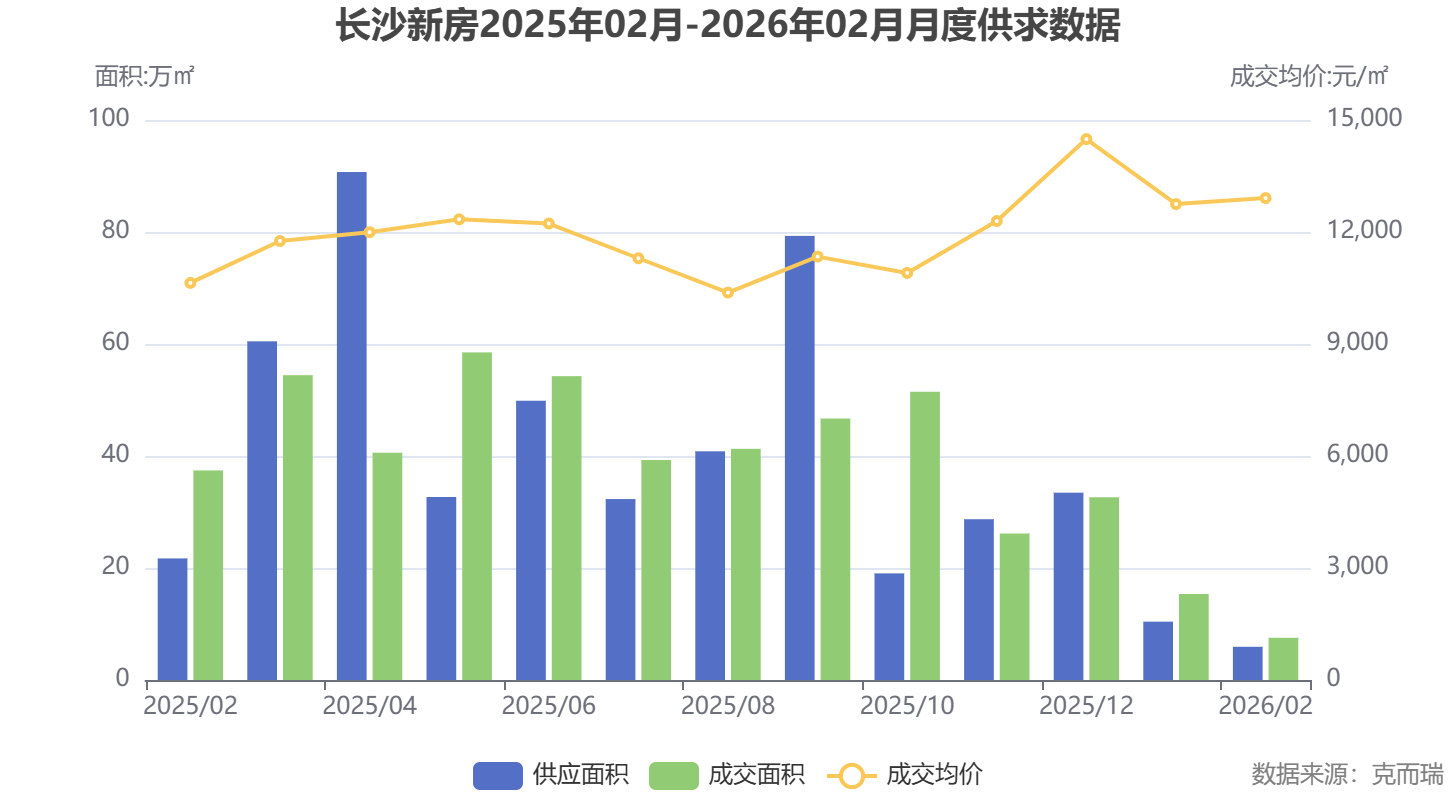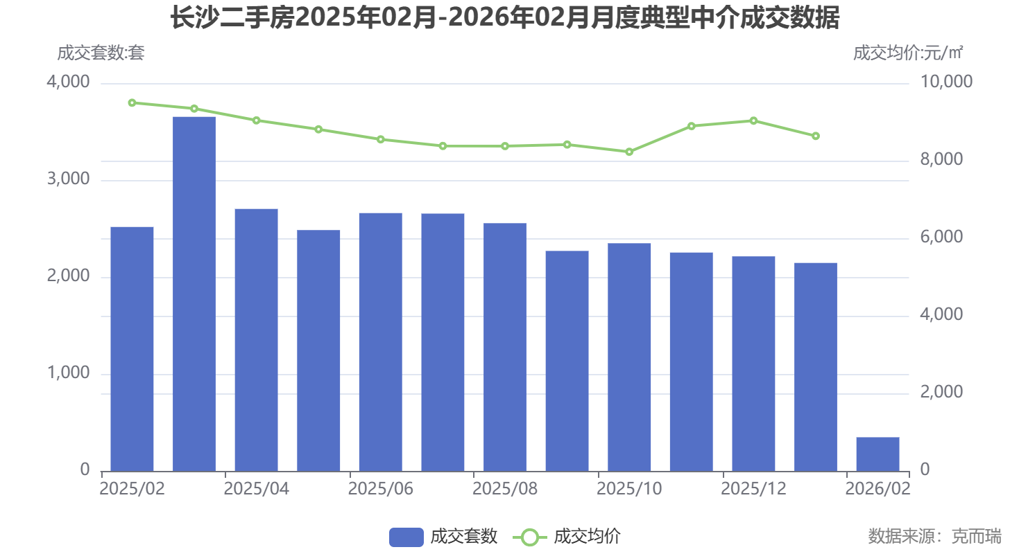 数据来源于克而瑞。2026年1月,长沙二手房成交套数达2145套,成交均价9032元/平方米,量价齐升,显示出强大的市场韧性。尽管2月受春节影响数据回落,但整体趋势向好,业主降价意愿减弱,买家信心增强。