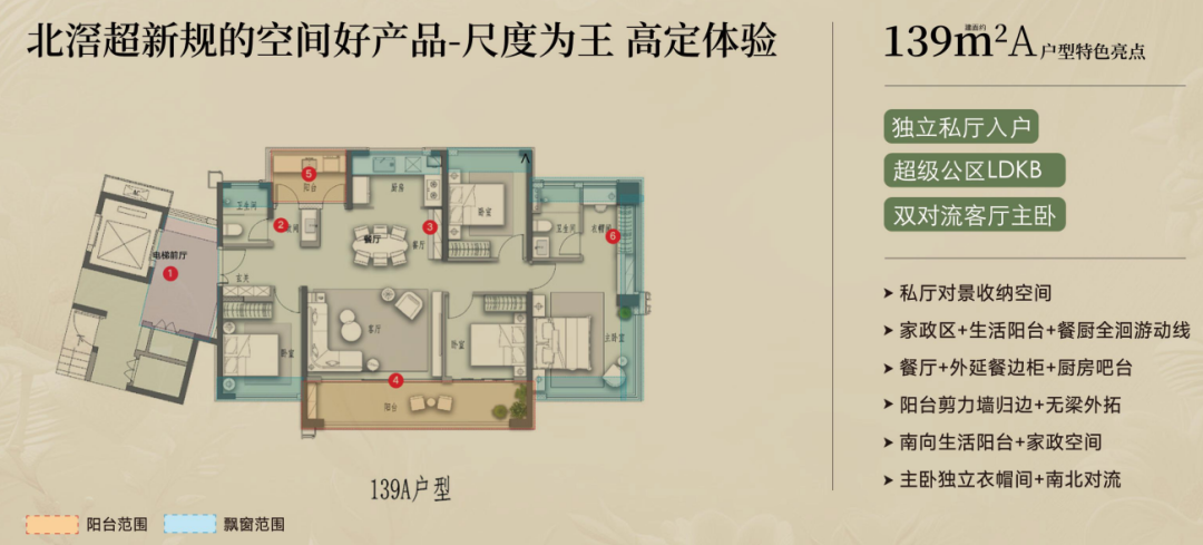 139㎡产品除了双厅南北对流外,主卧也能做到南北对流,且配套270°飘窗等。