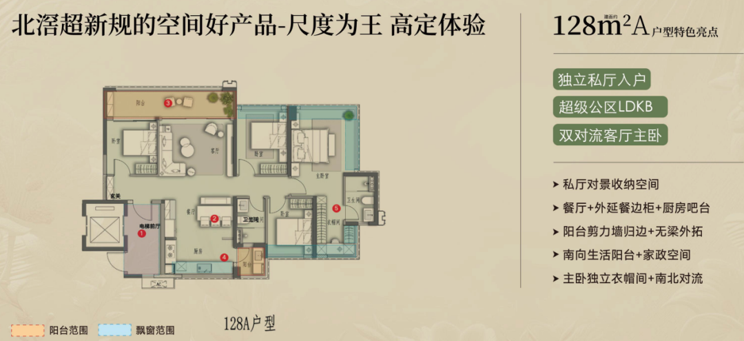 128㎡户型为双厅南北对流设计,配套入户对景收纳空间,主卧270°飘窗等。