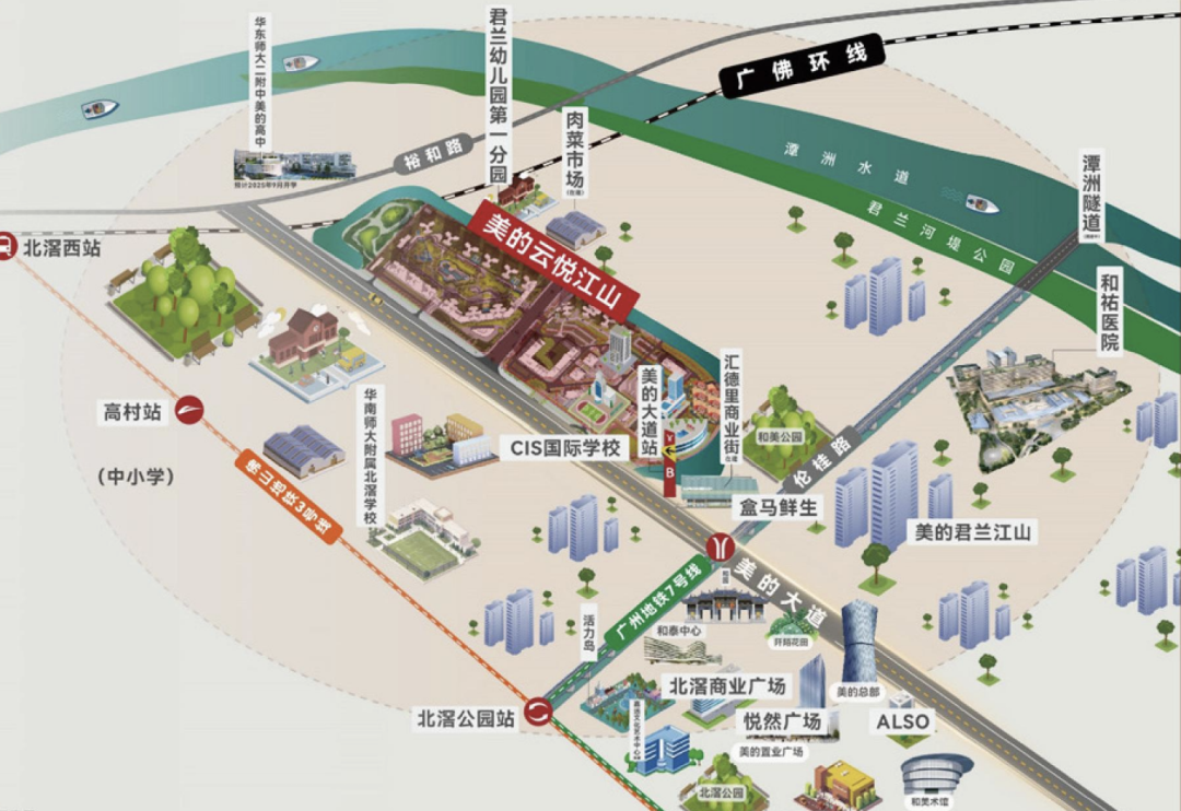 所有户型均为带装修发售,户户配有高性能静音窗、浴室音箱、多功能换气扇、天花氛围灯带、磁吸收纳等,而195㎡楼王产品则还将标配五恒微气候系统等。从地图上看,美的云悦江山就位于顺德北滘新城片区,靠近广州地铁7号线西延顺德段美的大道站,周边建有CIS国际学校、华南师大附属北滘学校、君兰幼儿园第一分园、汇德里商业街、和祐医院等。