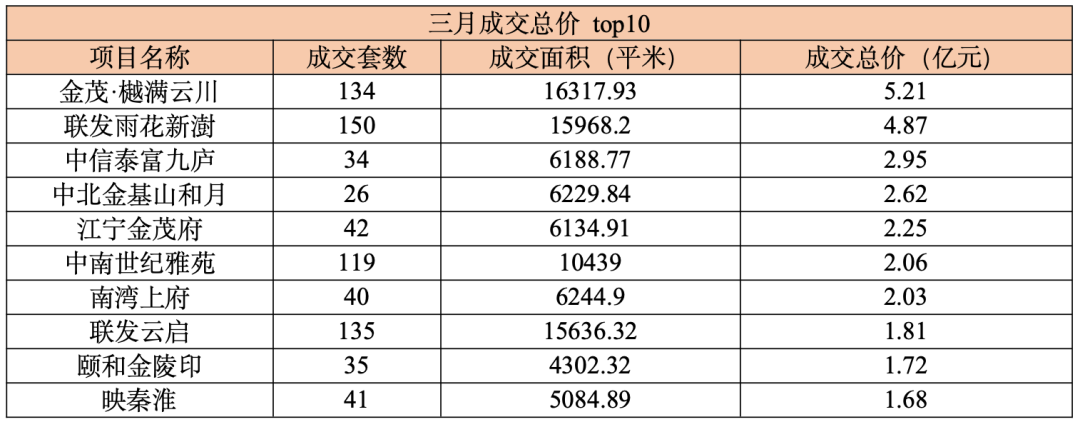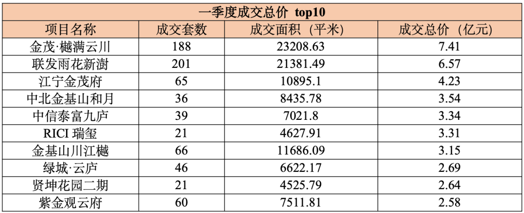 南京一季度住宅市场以存量项目为主,仅金茂樾满云川一个新盘上市。前十的楼盘贡献了39.46亿元的销售额,其中69%的业绩来自3月,销售额为27.2亿元。