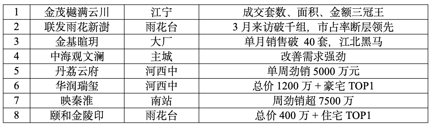 3月成交榜单前十中,区域改善楼盘占比超过一半,且均为板块内的价格标杆,说明置换需求类客户的观望情绪有所改变。金茂樾满云川、中信泰富九庐、中北金基山和月、江宁金茂府、颐和金陵印、映秦淮几个项目都可谓是“名利双收”,这说明在低价二手房抢占客群的大环境下,产品力仍是客户购买最大的动力。