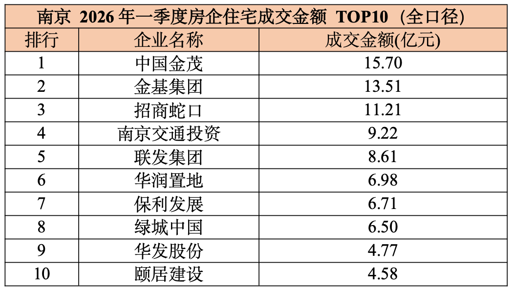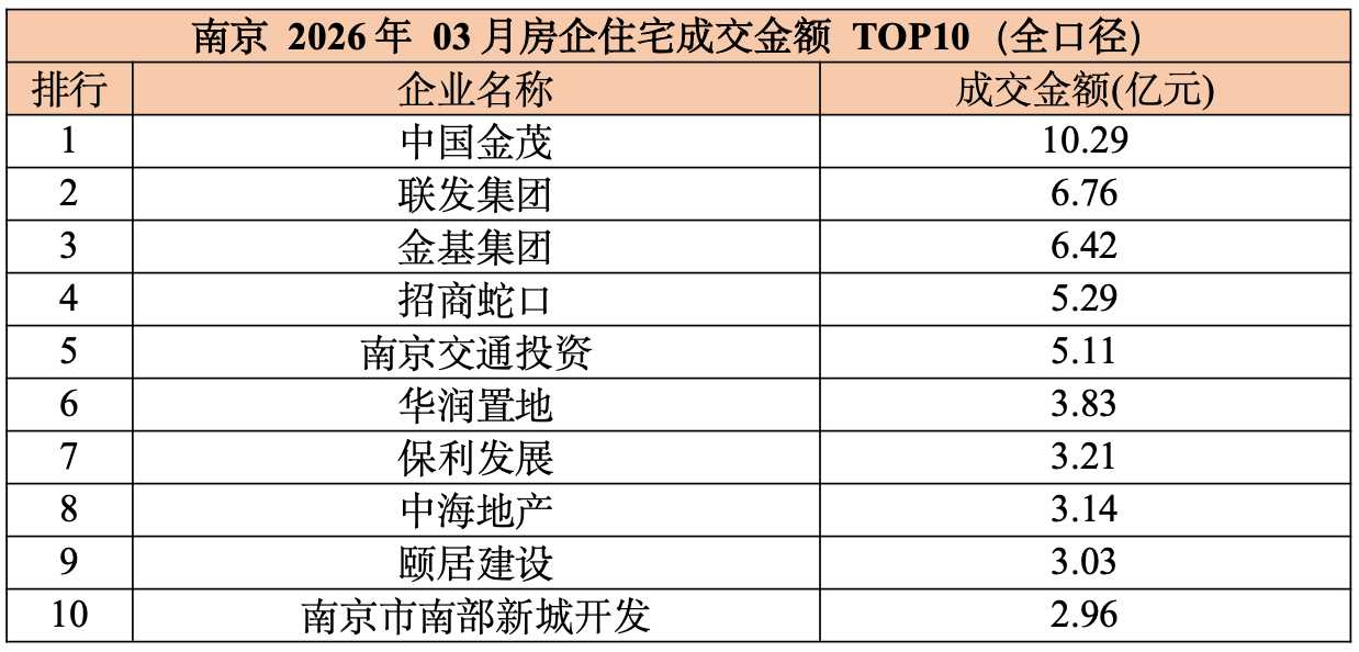 2026 年1-3 月,南京房企销售排行榜呈现明显的头部固化特征。中国金茂、金基集团、招商蛇口荣登全口径榜前三强,销售额均超10 亿元。头部房企凭借产品迭代、市场口碑、数字化营销构筑稳固优势,在行业规模理性回调背景下,市场份额向优质房企集中。