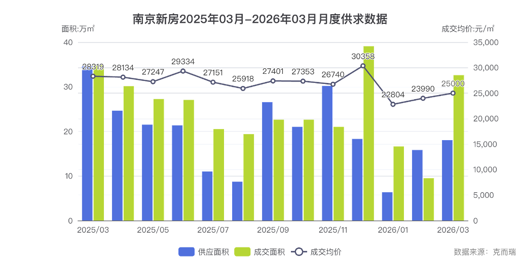 从月度走势看,3月成交面积 32.61 万㎡,已接近2025 年 12 月峰值水平。截至 3 月23 日,南京商品房认购 4389 套,成交4709 套,相比去年同期成交量上涨 11%。这一数据表明,南京楼市"金三"成色十足,市场修复趋势确立。