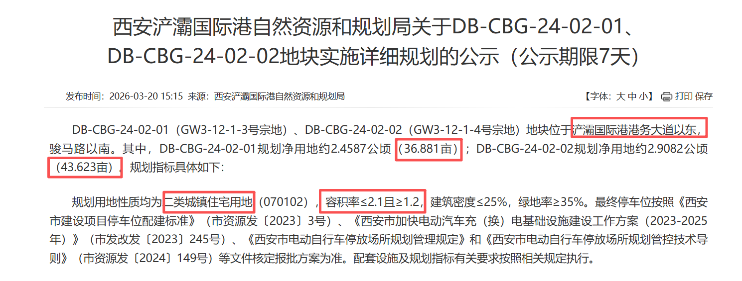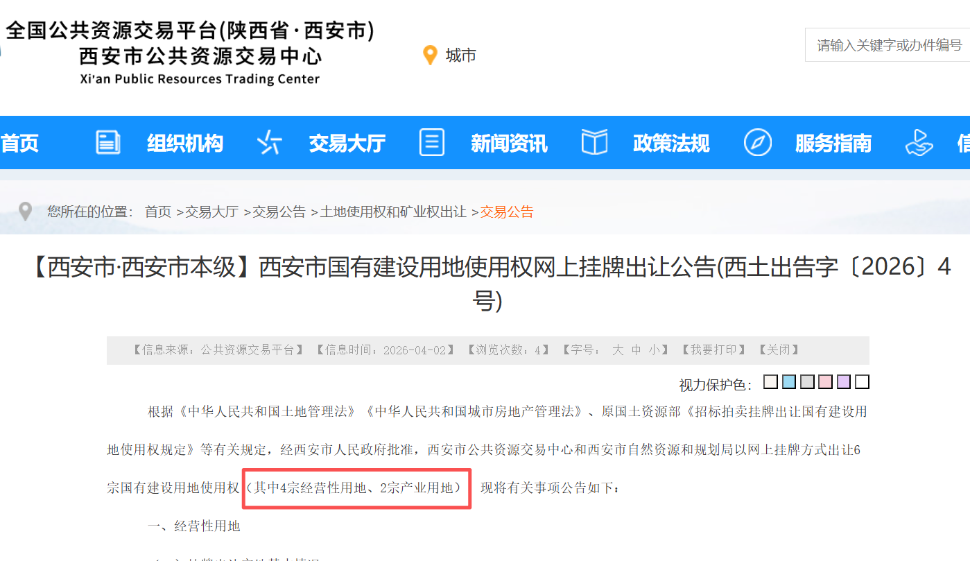 4月2日,西安市国有建设用地使用权网上挂牌出让公告(西土出告字〔2026〕4 号)正式发布。