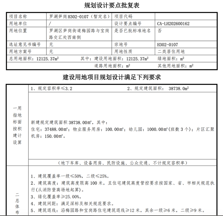根据规划设计要点,住宅地块(H302-0107)住宅部分37488㎡,配建3班幼儿园1000㎡、物业用房100㎡、片区机房150㎡,以及社区活动场地、儿童游戏场地等公共配套。