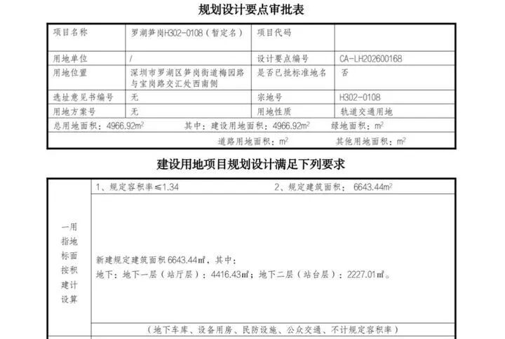 另一宗轨道地块(H302-0108),属于轨道交通用地,即地铁17号线一期工程,按三维宗地分层设权;位于地下,其中地下一层投影面积4416.43㎡,地下二层投影面积2227.01㎡,总建面6643.44㎡。主要用于地铁站厅层及站台层的建设。
