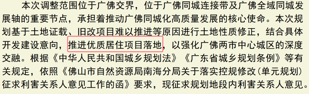 值得一提的是,调规文件提到,此次调规正是基于土地证载、旧改项目难以推进等原因进行土地性质修正,结合具体开发建设意向,推进优质居住项目落地,以强化广佛两市中心城区的深度交融。
