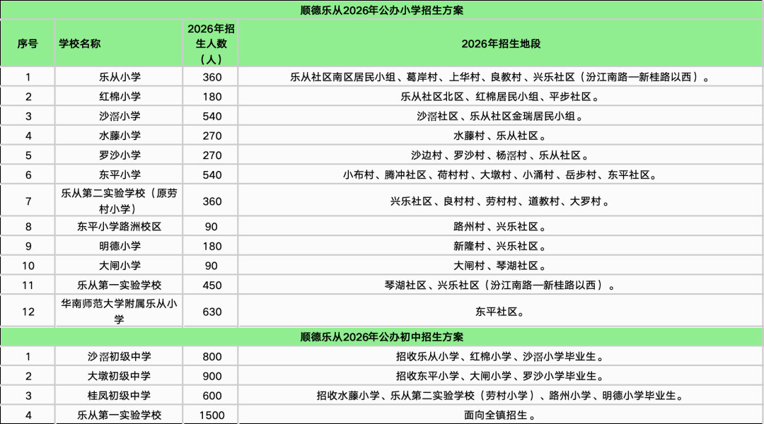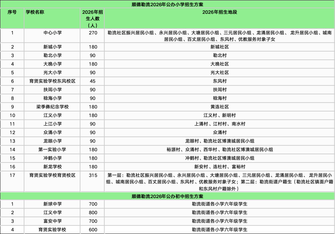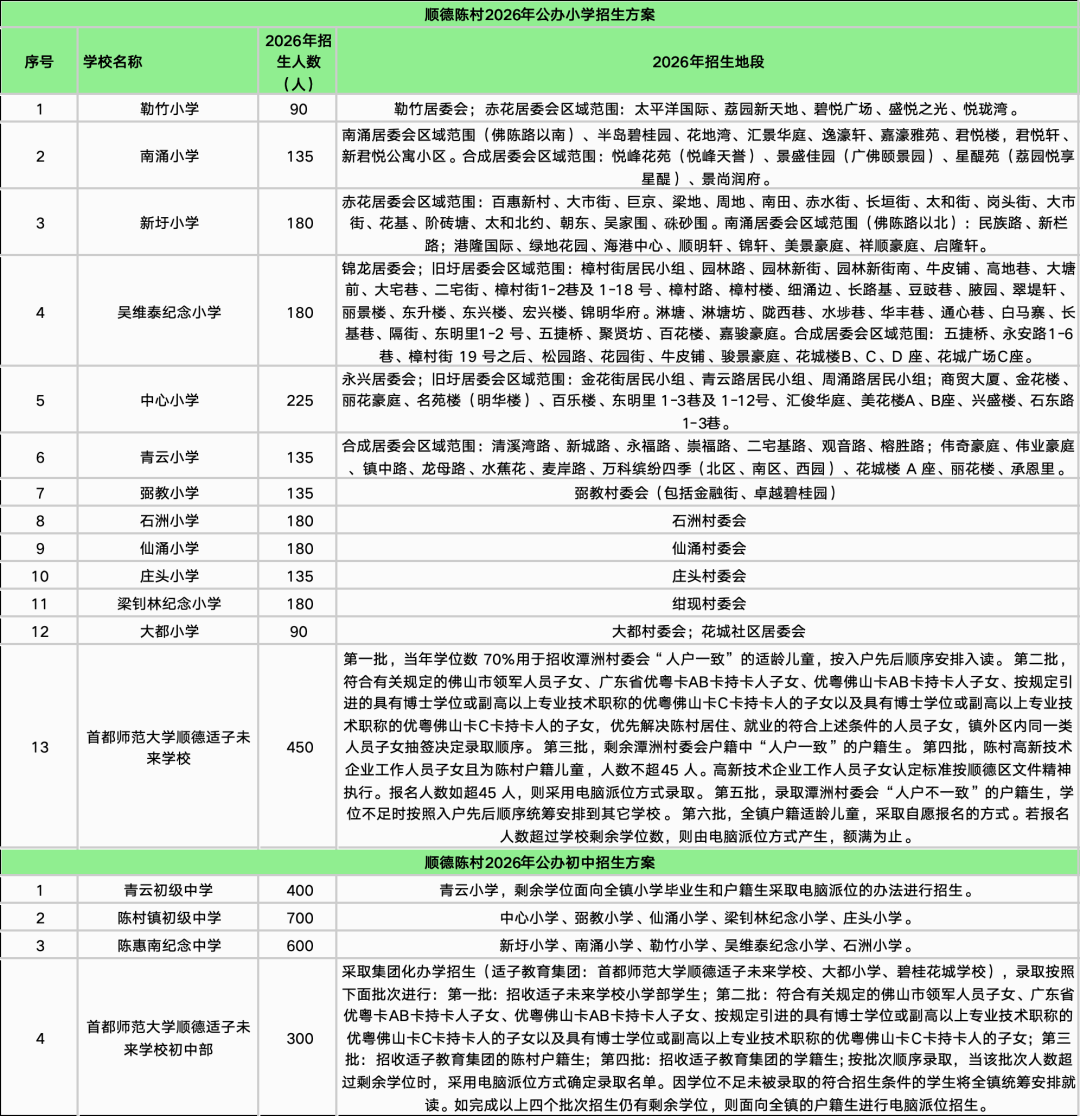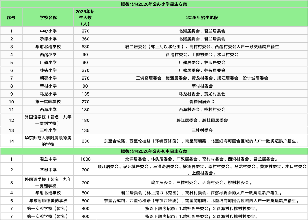 随着最后一个镇街勒流招生方案的披露,顺德十镇街2026年公办中小学招生学区终于齐了!经乐居梳理,今年顺德公办中小学的招生学区主要有以下变化:1、部分学校学区调整。2025年华附北滘学校和华东附顺德美的学校均为面向全镇招生,而2026年则调整为华附北滘学校明确了招生对象为“君兰居委会(林上河以北范围)、高村村委会、西滘村委会的人户一致类适龄户籍生”;而华东附顺德美的学校的范围为东至合成路、西至伦桂路(环镇西路段)、南至简明路、北至细海河围合区域的人户一致类适龄户籍生。2、多所学校更名整合。碧江中学、碧江小学和坤洲小学被整合为北滘镇外国语学校(暂名);北滘镇第二实验小学(原高村小学)被整合为华南师范大学附属北滘学校的一年级;原“西华小学”今年停招,其原招生地段独有的西华村被划入第一实验小学的招生范围;“东风小学”更名为“育贤实验学校东风校区”,可能意味着被纳入育贤实验学校体系。3、部分小学升格为九年制学校北滘第一实验小学升格为九年一贯制学校,从2026学年起增设初中部。4、新增了部分楼盘地段