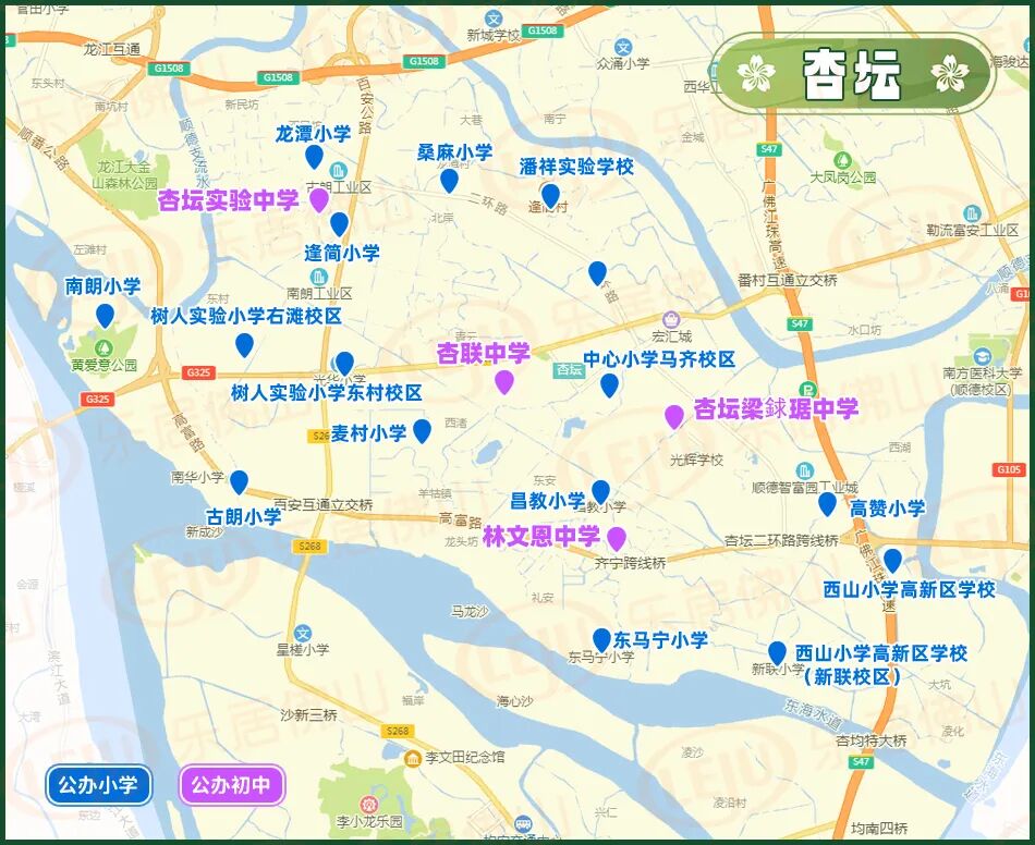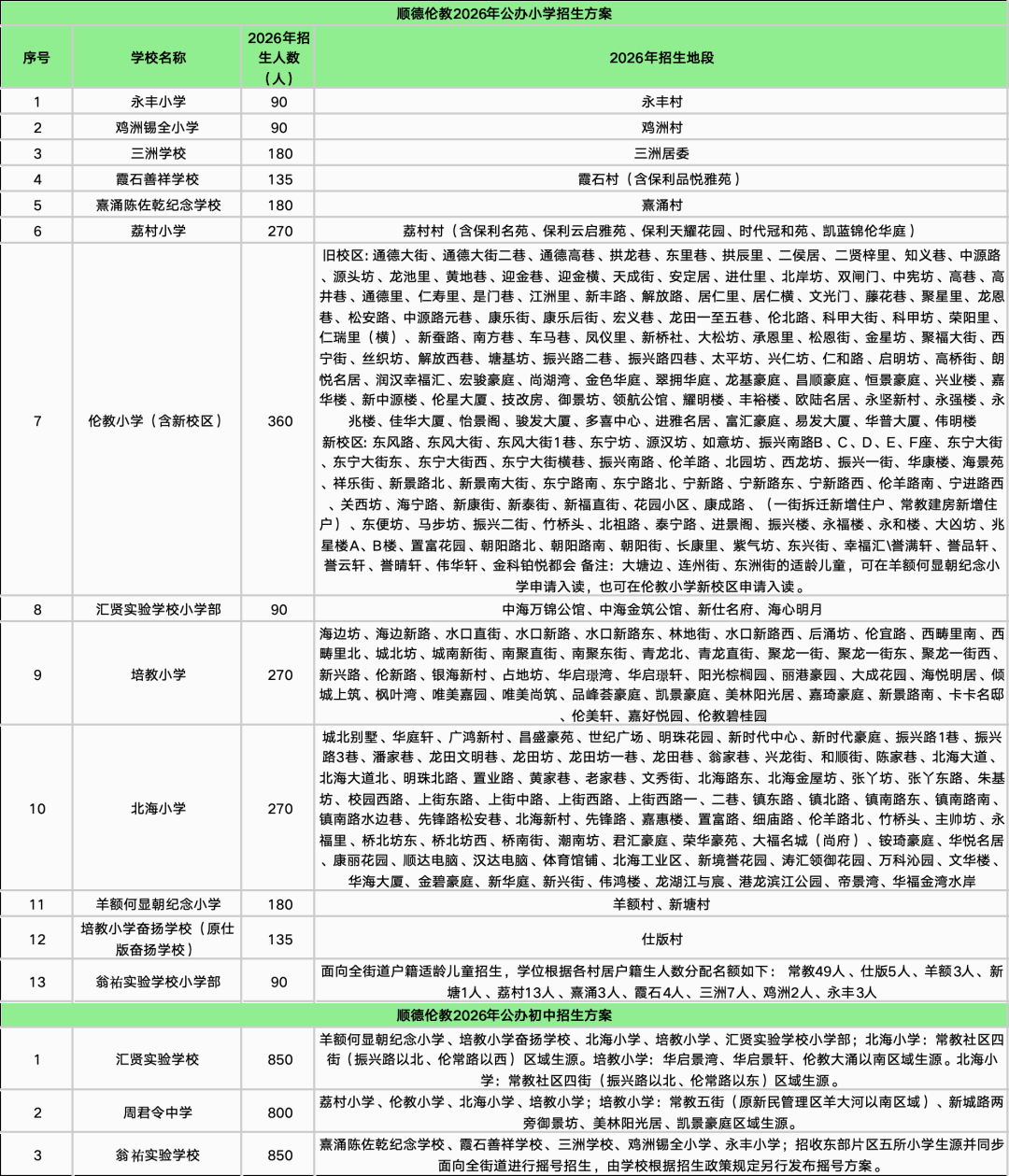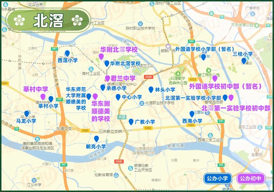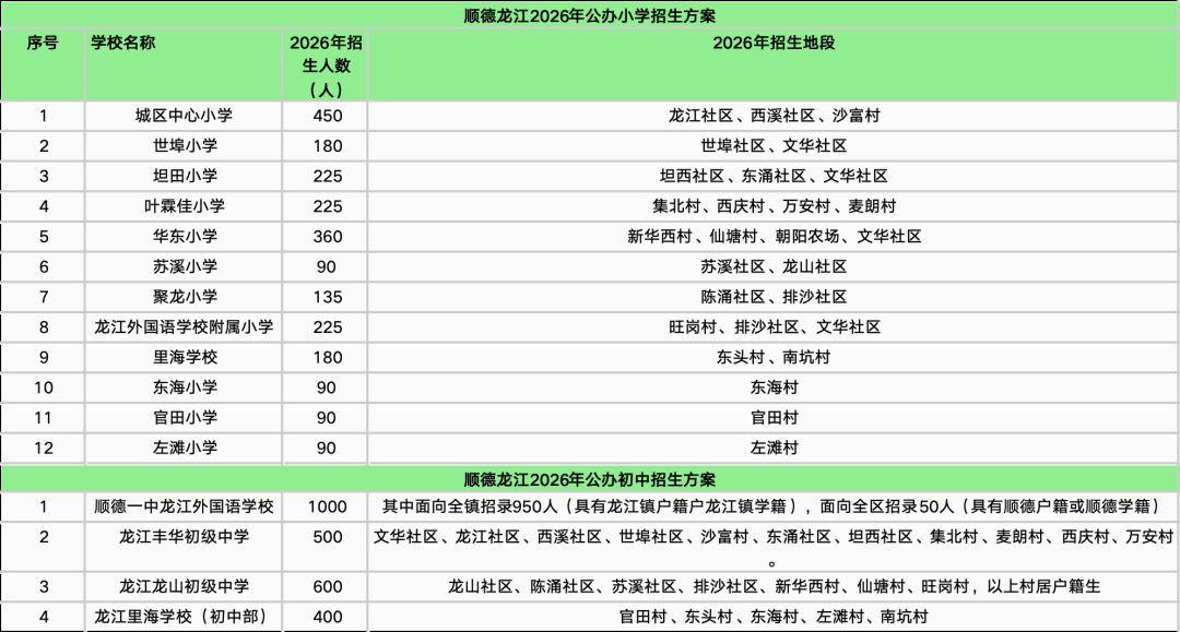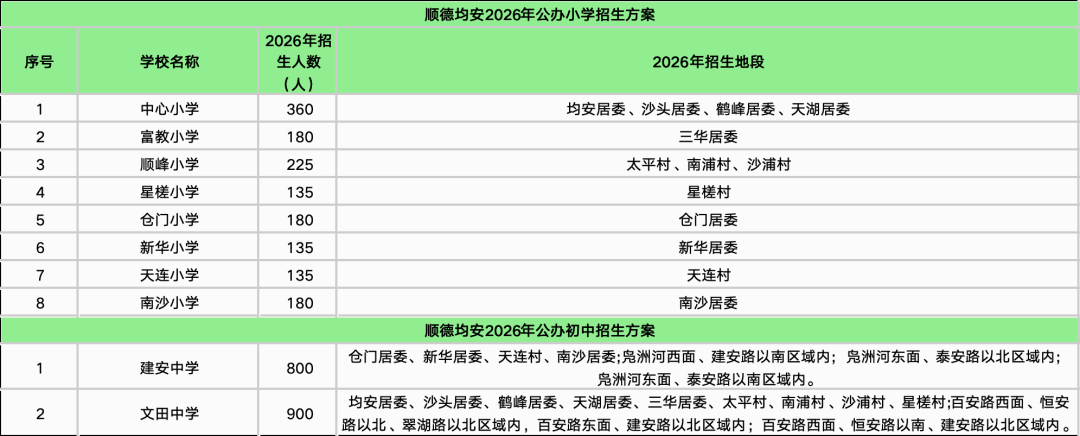 随着最后一个镇街勒流招生方案的披露,顺德十镇街2026年公办中小学招生学区终于齐了!经乐居梳理,今年顺德公办中小学的招生学区主要有以下变化:1、部分学校学区调整。2025年华附北滘学校和华东附顺德美的学校均为面向全镇招生,而2026年则调整为华附北滘学校明确了招生对象为“君兰居委会(林上河以北范围)、高村村委会、西滘村委会的人户一致类适龄户籍生”;而华东附顺德美的学校的范围为东至合成路、西至伦桂路(环镇西路段)、南至简明路、北至细海河围合区域的人户一致类适龄户籍生。2、多所学校更名整合。碧江中学、碧江小学和坤洲小学被整合为北滘镇外国语学校(暂名);北滘镇第二实验小学(原高村小学)被整合为华南师范大学附属北滘学校的一年级;原“西华小学”今年停招,其原招生地段独有的西华村被划入第一实验小学的招生范围;“东风小学”更名为“育贤实验学校东风校区”,可能意味着被纳入育贤实验学校体系。3、部分小学升格为九年制学校北滘第一实验小学升格为九年一贯制学校,从2026学年起增设初中部。4、新增了部分楼盘地段