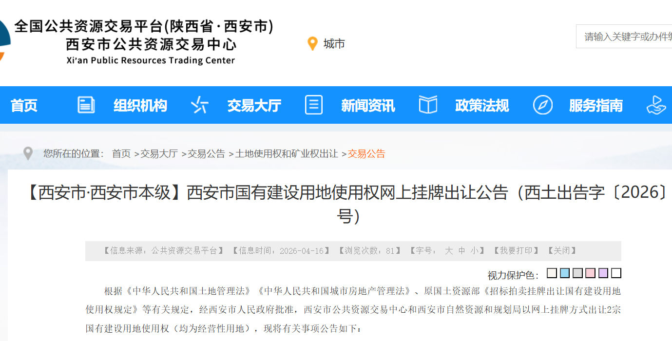 新城区和雁塔区2宗地出让 网上挂牌期限为5月6日至5月18日
