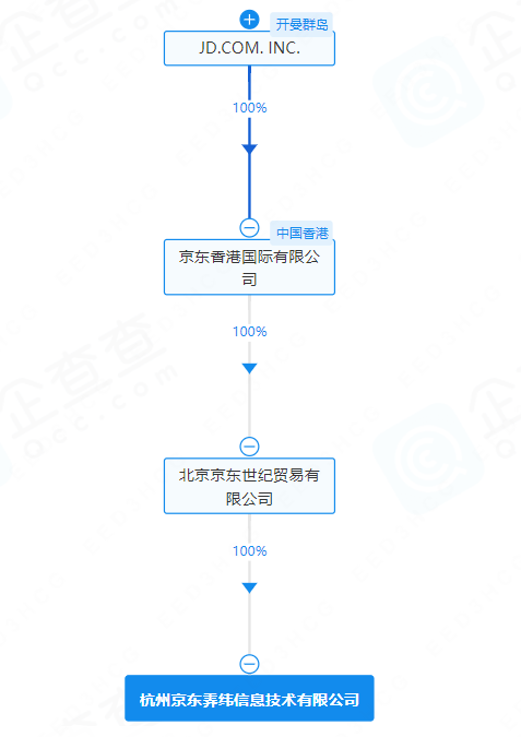 企查查信息显示,杭州京东霁纬信息技术有限公司的母公司为JD.com, Inc.(京東集團股份有限公司),持股100%。