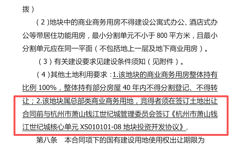 出让合同中明确,地块竞得者需在签订合同出让前与杭州市萧山钱江世纪城管理委员会签订《杭州市萧山钱江世纪城核心单元XS010101-08地块投资开发协议》。