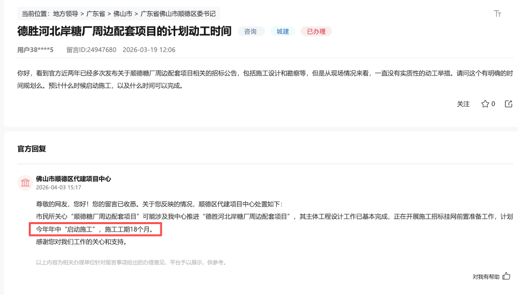 4月3日,顺德区代建项目中心处置如下:市民所关心“顺德糖厂周边配套项目”可能涉及我中心推进“德胜河北岸糖厂周边配套项目”,其主体工程设计工作已基本完成,正在开展施工招标挂网前置准备工作,计划今年年中“启动施工”,施工工期18个月。