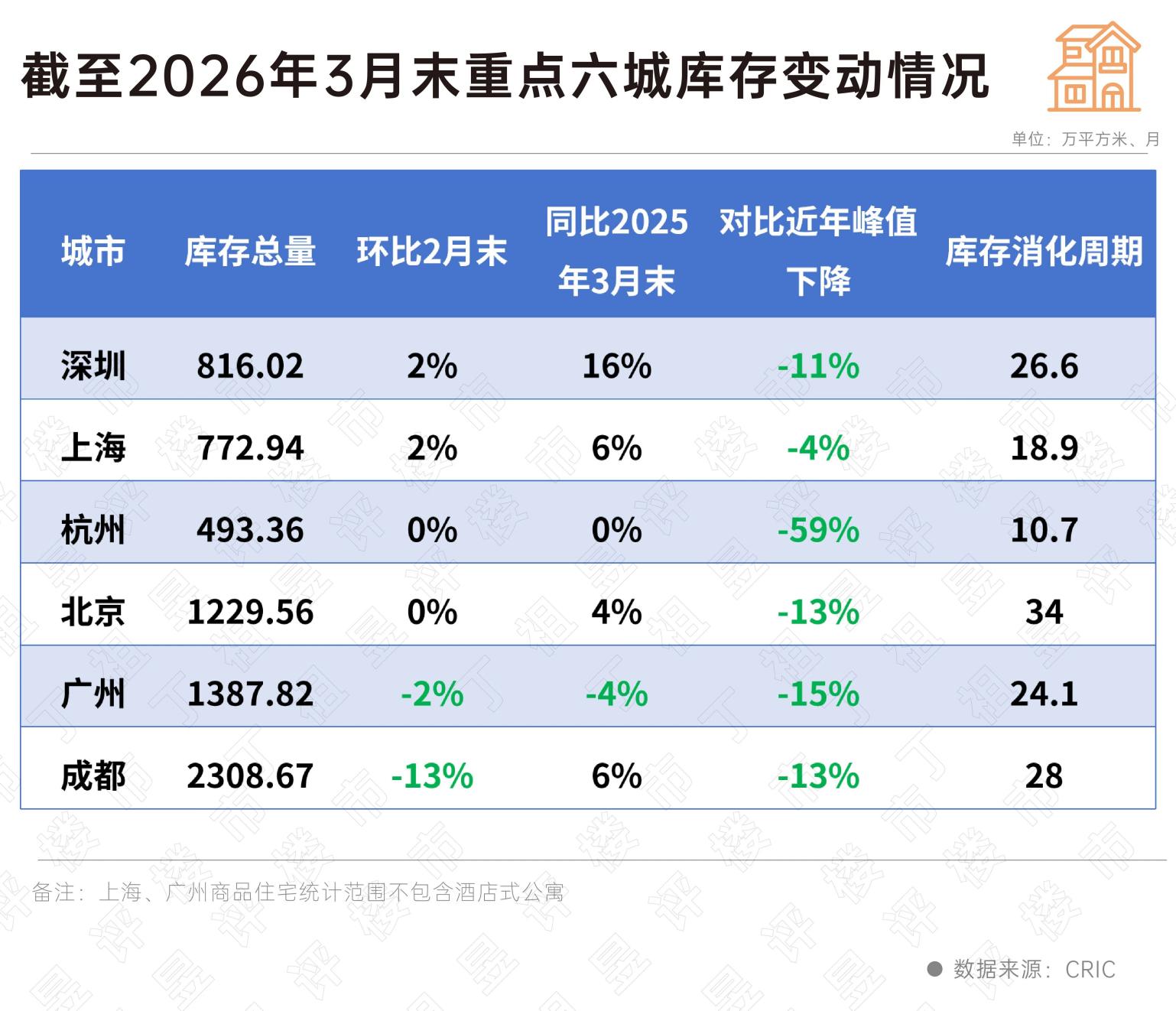 上述六城中广州库存去化表现亮眼,截至3月末,广州商品住宅存量规模1388万平方米,对比2025年末下降了51万㎡,整体去化周期24.1个月,对比2025年末缩短了0.7个月,库存压力稳步缓解。