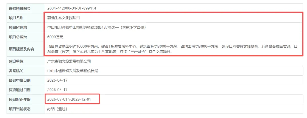 近日(4月17日),广东省投资项目在线审批监管平台正式公示嘉驰生态文化园项目备案信息,该项目已通过中山市坦洲镇发展改革和统计局复核,标志着这一农文旅融合重点项目进入落地实施新阶段中山市人民政府。