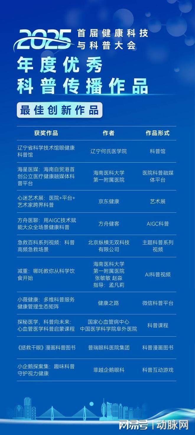 在 “健康中国 2030” 战略深入推进、健康科技与科普融合发展的背景下,由中国科技新闻学会、海南省医学学术交流管理中心指导,中国科技新闻学会健康传播专委会、北京陈菊梅公益基金会主办,海南省科学技术协会、文昌市人民政府、海南省医学会支持,子午互联网医院、动脉网承办的2025 首届健康科技与科普大会年度健康科普传播典型案例评选活动圆满落幕。