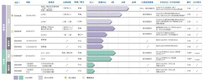 依托这些平台,岸迈生物已有7条自主开发的在研管线,适应症涵盖血液瘤、实体瘤、自免疾病。其中,核心管线EMB-01是全球率先进入治疗结直肠癌Ⅱ期临床试验的EGFR/cMET双抗,有望克服单靶点疗法的耐药问题。招股书显示,2025年5月,岸迈生物提交的EMB-01单药治疗三线转移性结直肠癌的IND申请,已获CDE批准,预计将于2025年年末前启动该单药Ⅱ期临床试验。