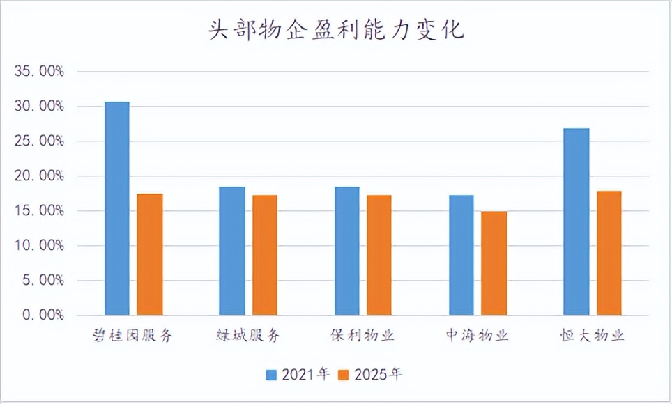 其中下滑幅度大的如碧桂园服务,从2021年到2025年毛利率下滑了13.2个百分点,下滑幅度少的保利物业,毛利率也下降了1个百分点。