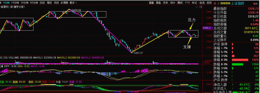 从技术上看,大盘周四处于窄幅震荡格局,1分钟级别中枢震荡已经演变成了5分钟级别中枢震荡结构,说白了方向还没有选择,上方压力位3340点,下方支撑位3310点附近,预计周五应该就要选择方向,如果你问本人偏向多头还是空头,本人主观上是站在多头这边,如果可以突破3340点,大概率就会加速上攻3400点附近,而且要上攻的话应该就是周五。而创业板目前依然处于日线级别中枢下轨,我觉得调整空间不大,做多也就在形成一笔15分钟级别调整,而且这种调整背驰的概率很大。周五重点关注:医药股反抽,网红经济、券商。
