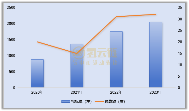 图表4 2020-2023年国内燃料电池车招标情况 单位:辆、亿元